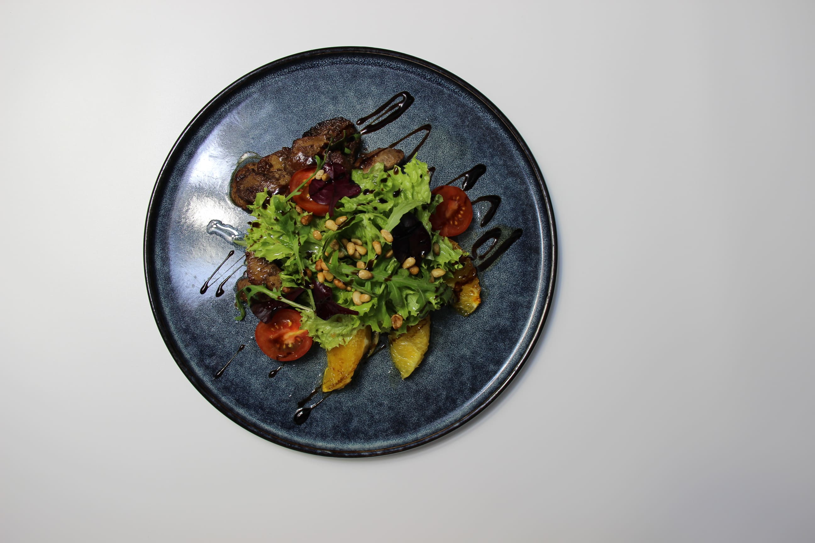 куриная печень, томаты черри, мякоть апельсина, микс зелени и листа салата, кедровый орех и медово – горчичная заправка