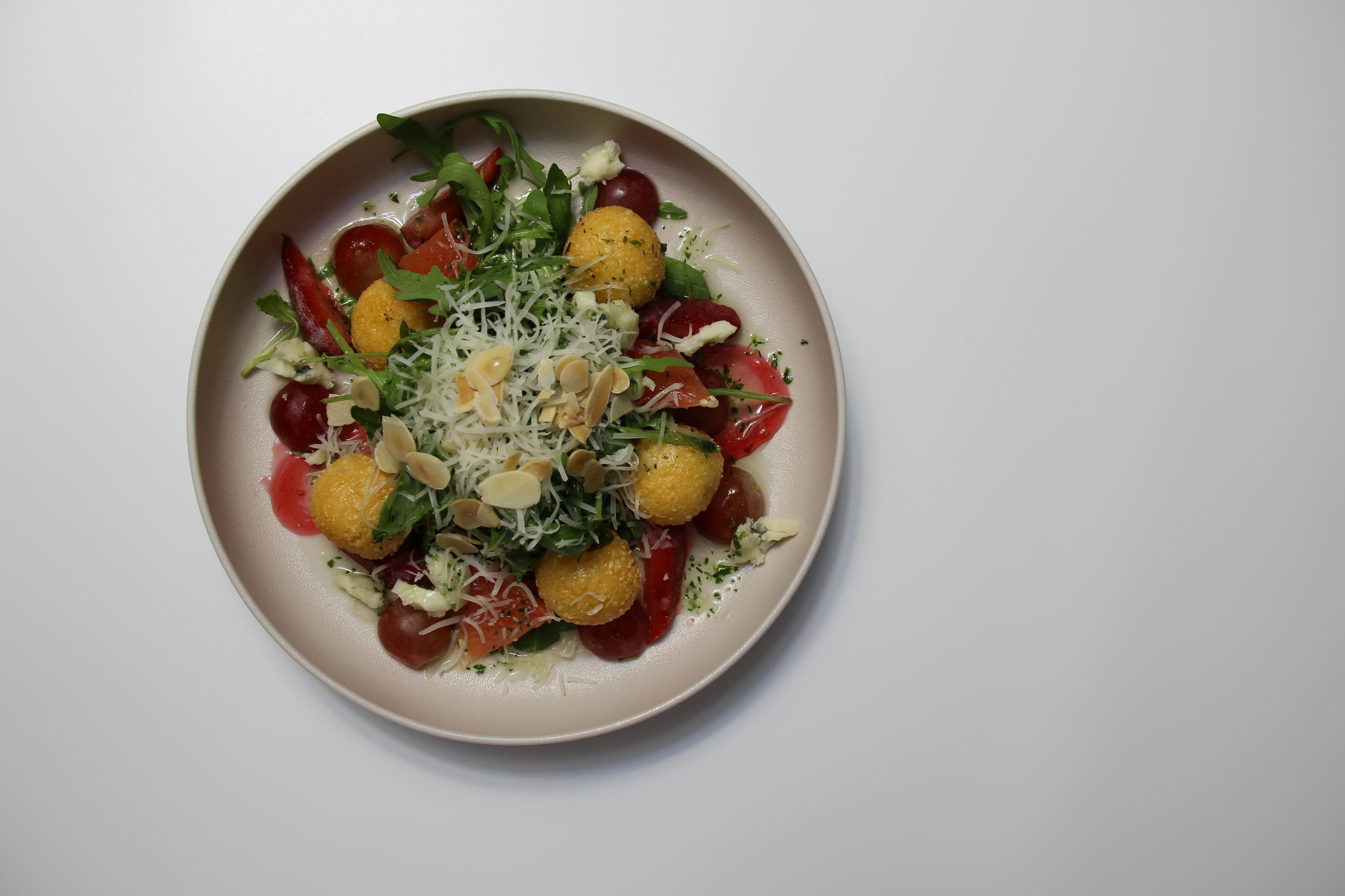 руккола, микс фруктовых и ягодных нот с сырными шариками и горстью орехов, медово – горчичная заправка
