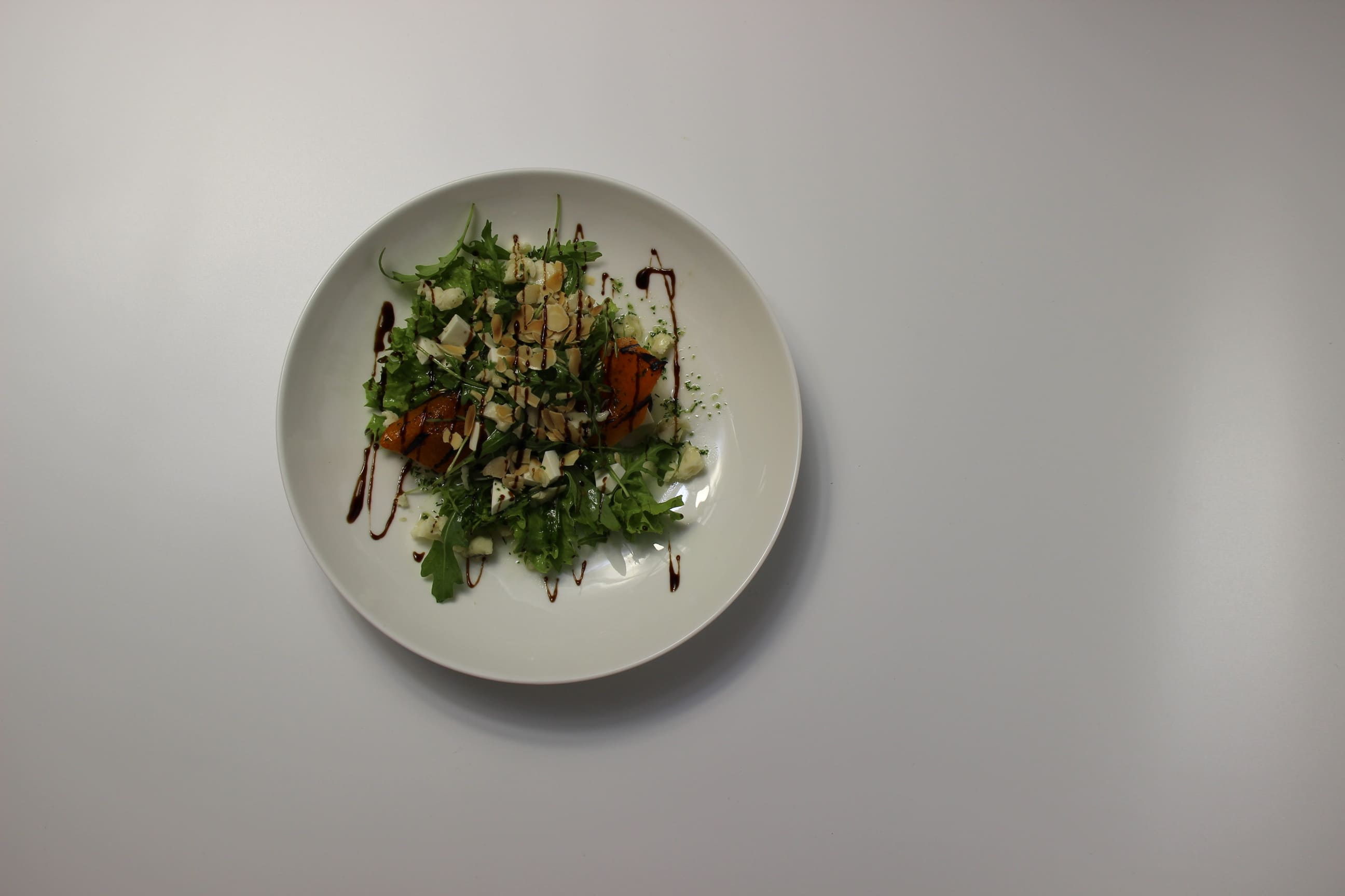 печёная тыква, сыр «Дор – блю», сыр «Фетакса», руккола, лепестки миндаля, бальзамический крем, медово – горчичная заправка