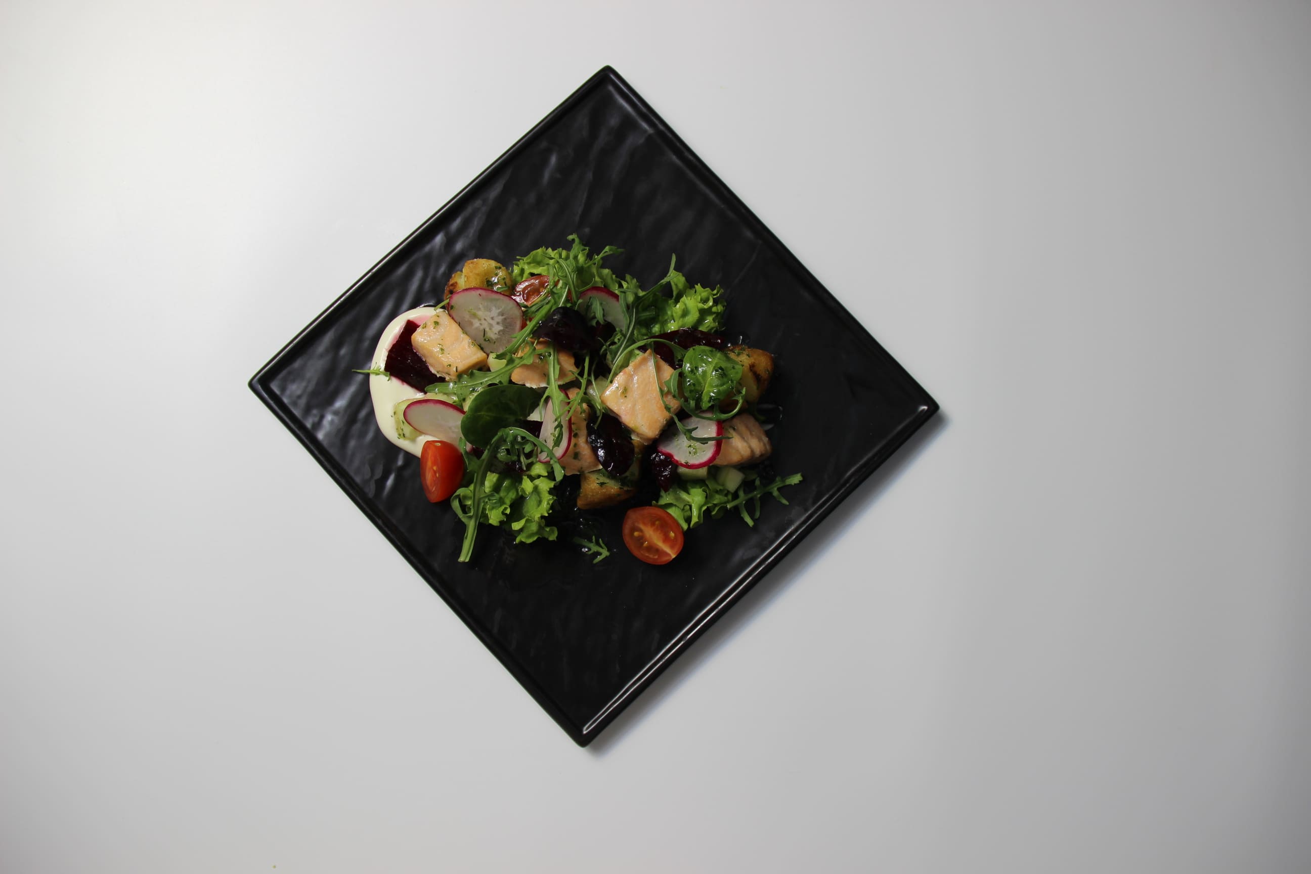 ростбиф, вяленые томаты, молодой картофель, томаты черри, конкассе из свежего огурца, микс салатов, перепелиное яйцо, ореховый соус