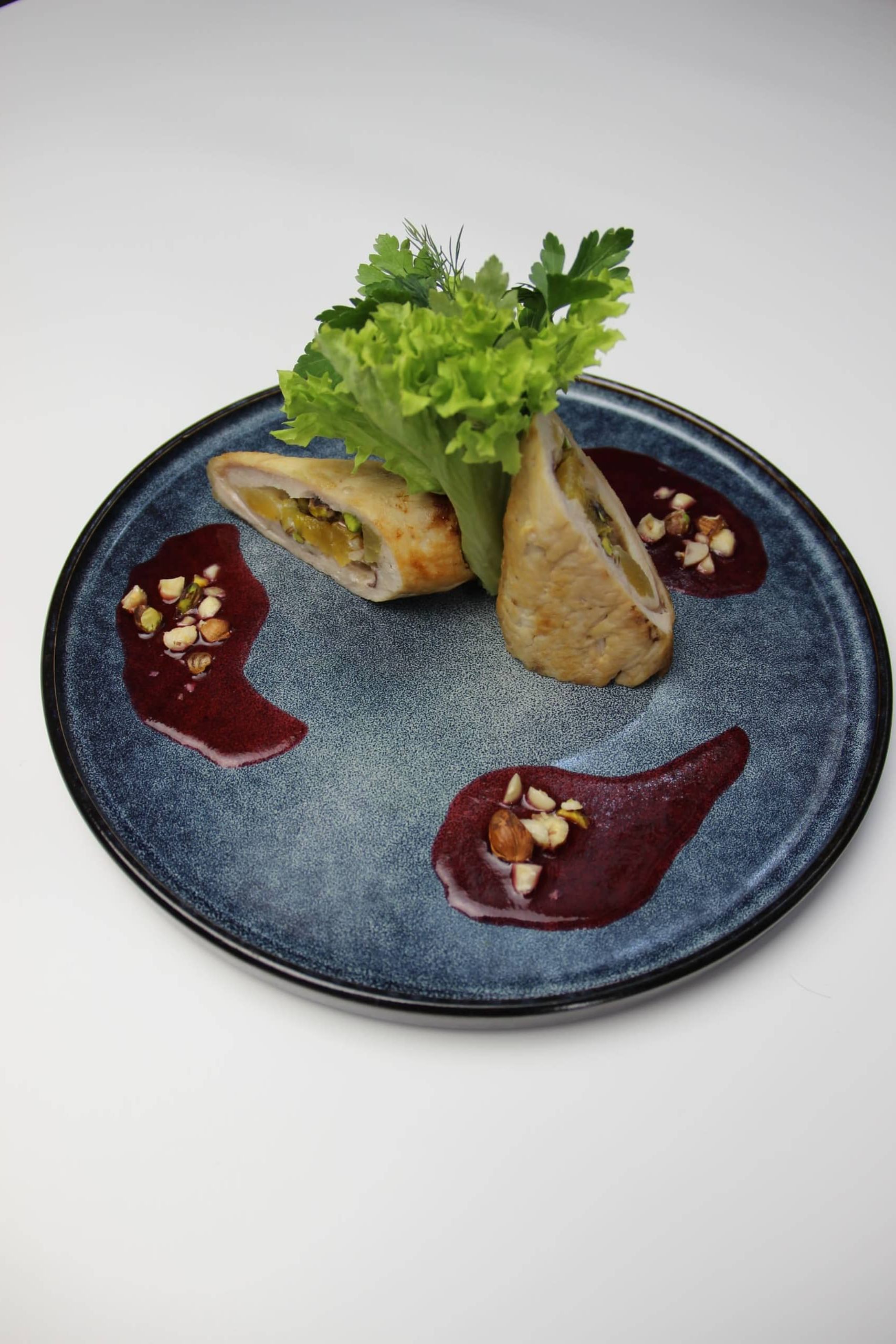 куриное филе с фисташками, курагой и ягодным соусом
