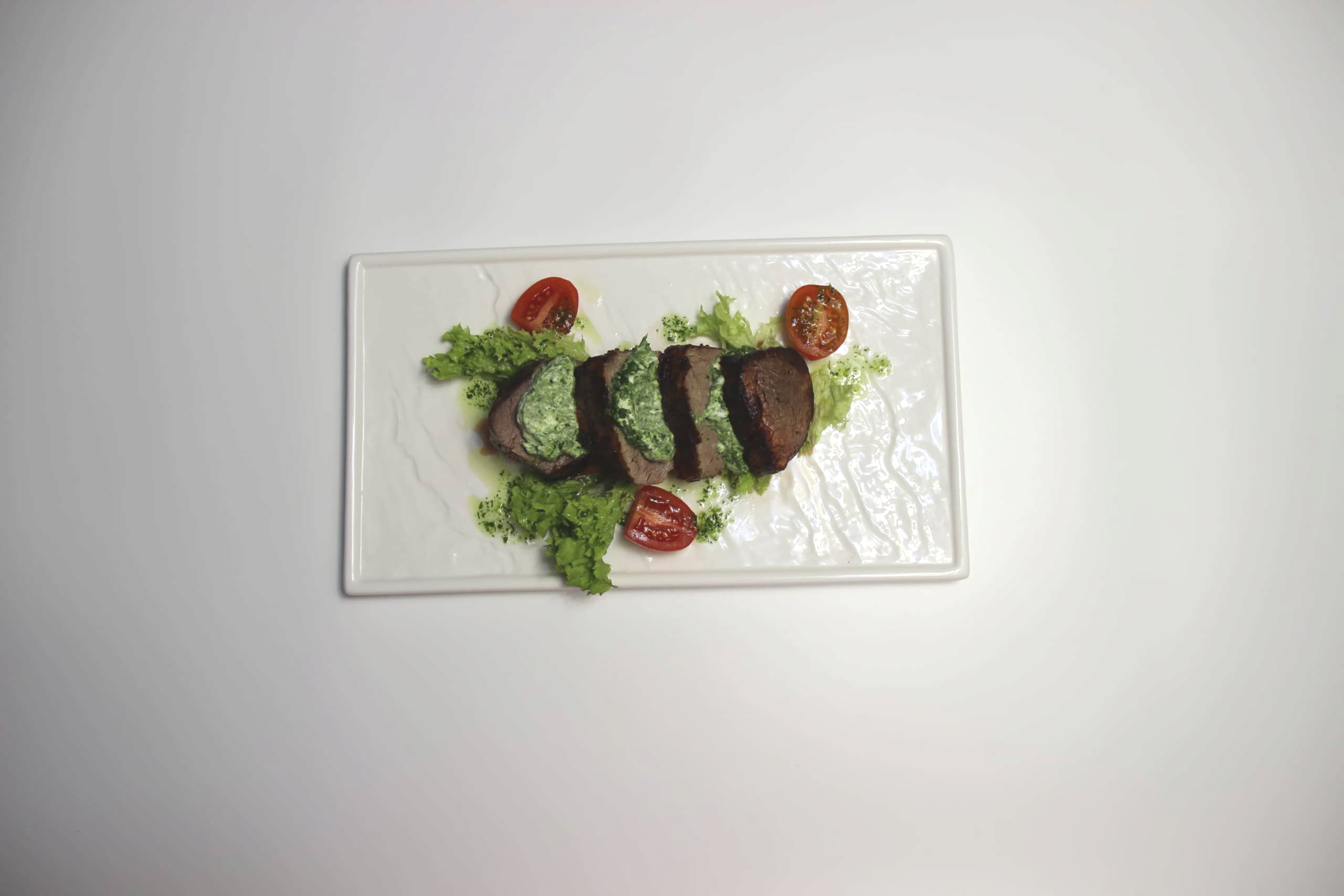 медальоны из говяжьей вырезки на гриле, с тёплым муссом из шпината и творожного сыра