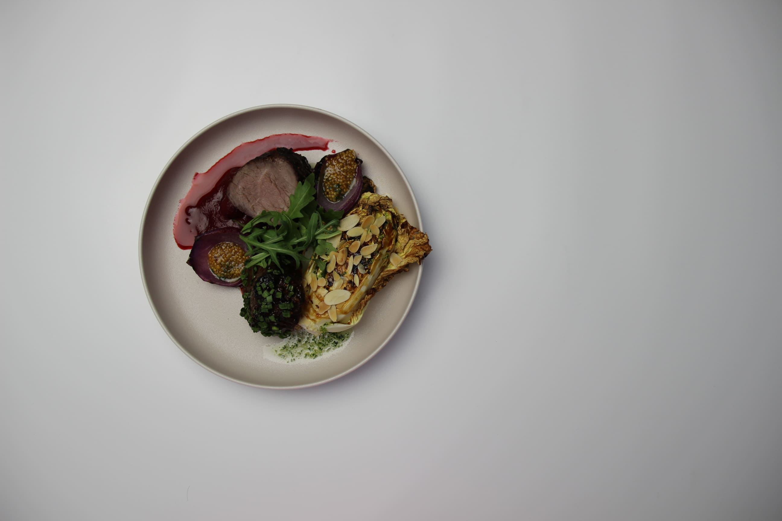 | вырезка телёнка бережно обжаренная до t° – 66°С, капуста гриль, вишнёвый соус, опаленный лук и лепестки миндаля |
