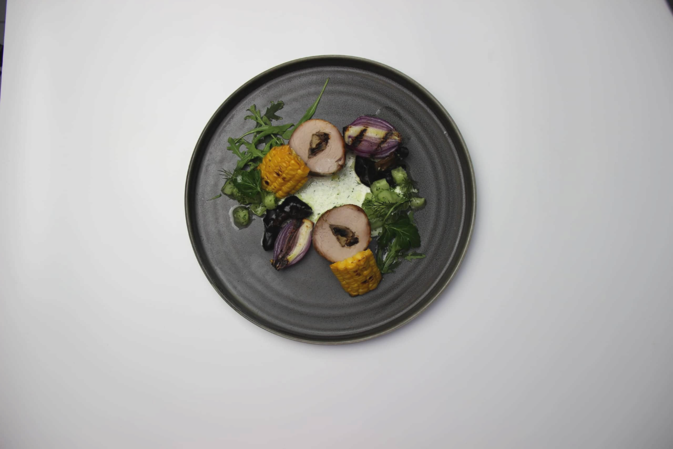 сливочно – винный соус, кукуруза, опаленный лук, древесные грибы