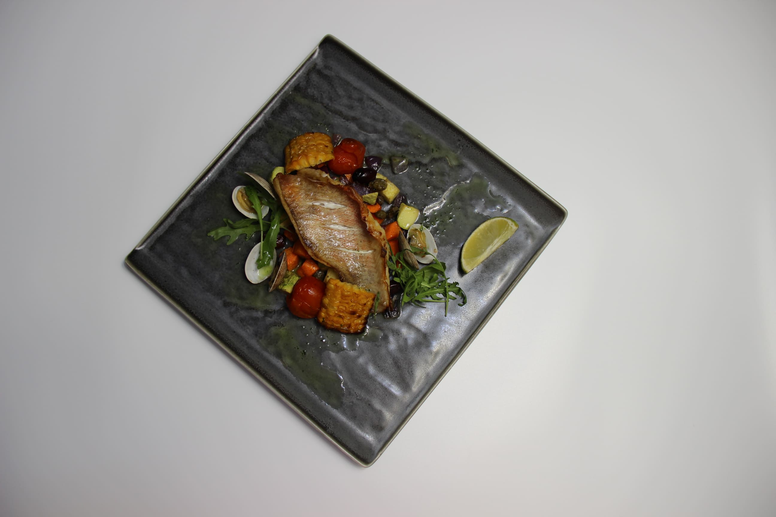 | филе морского окуня, соте овощей и вонголе, соус Песто |