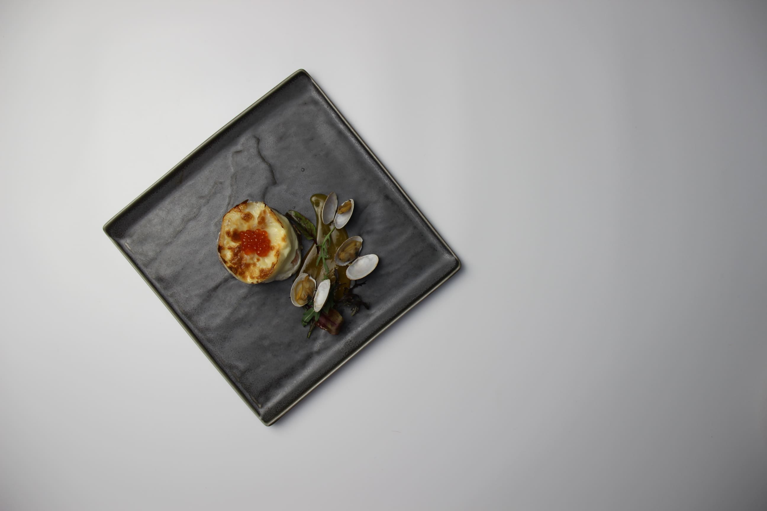 мидии «Киви», осминожки, тигровые креветки, кусочки сёмги, приправленные в вине в сливочно-горчичном соусе, икра красная
