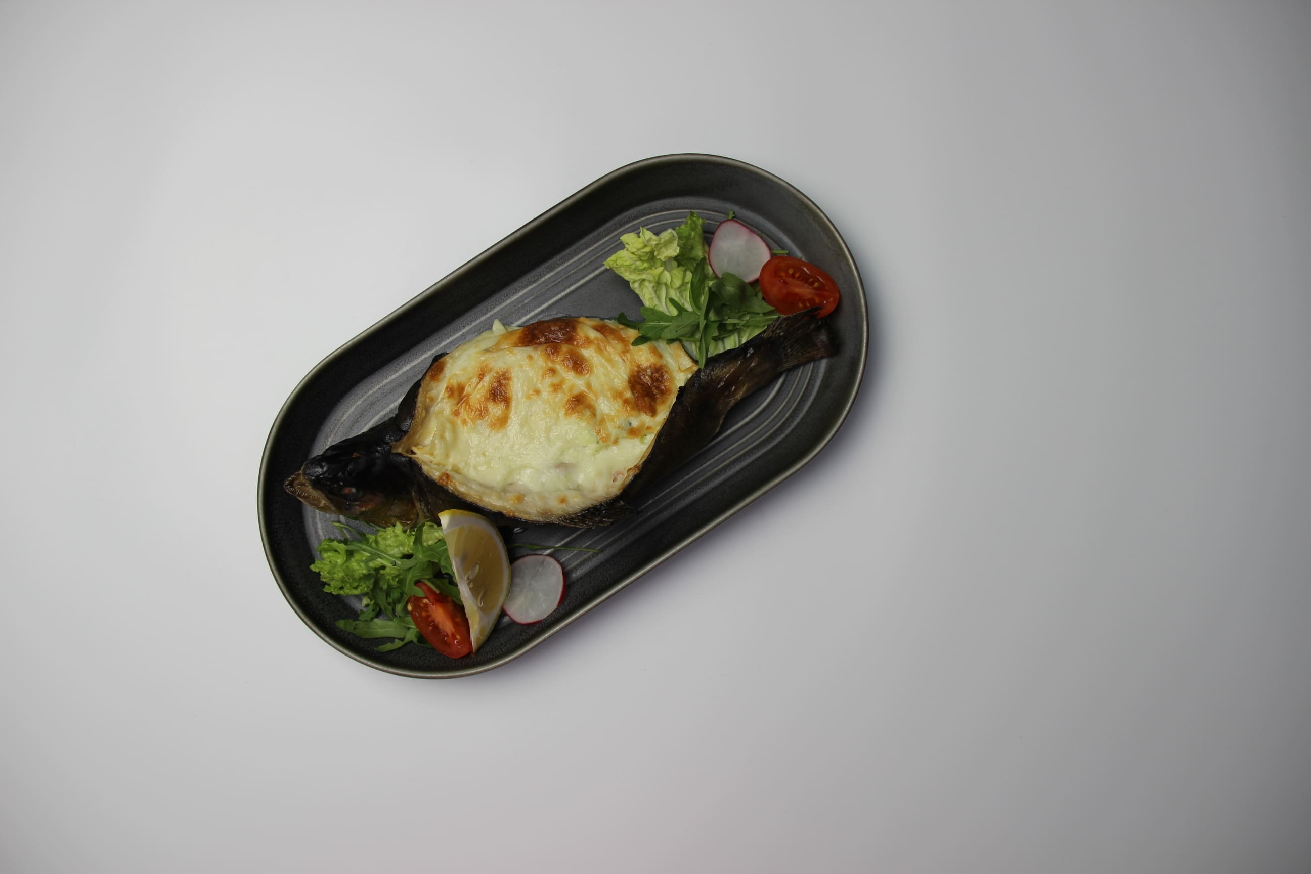 нежные кусочки филе говяжьей вырезки и куриного филе, в сопровождении овощей в сливочном соусе под сыром