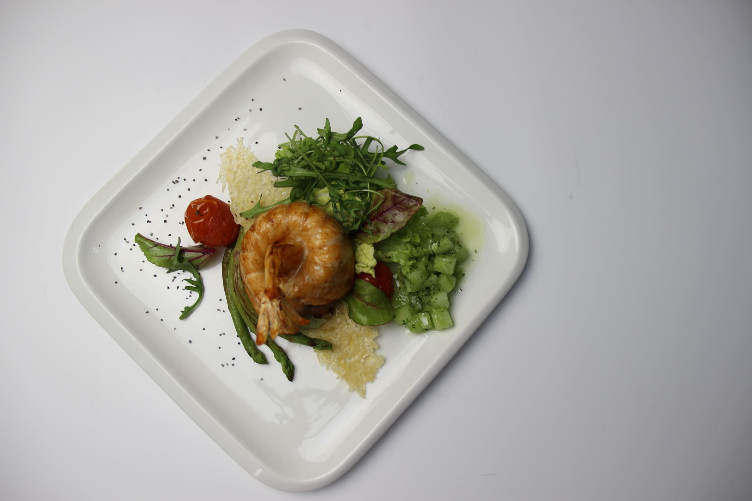креветки, томаты черри, пармезан, кедровый орех, руккола, бальзамический крем, оливковое масло